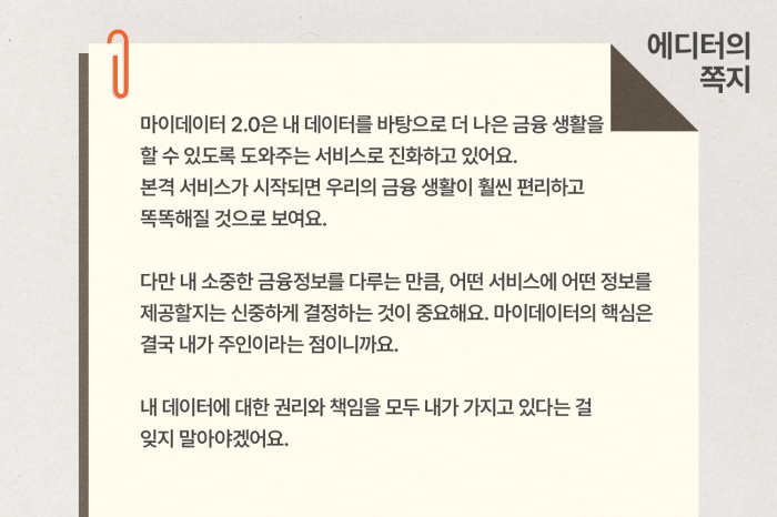 최근 금융위원회가 마이데이터 2.0 시행을 6월 19일로 연기했다는 뉴스가 나왔어요. 업계에서 기술적 준비와 행정 절차 부담을 호소한 결과인데요. 실제로 다수의 마이데이터 사업자들이 시행일이 임박한 시점에 새로운 기술·행정 과제가 추가되면서 현실적으로 준비가 어렵다고 불만을 표했어요. 한국인터넷진흥원이 최근 사업자들에게 연계정보 생성·처리를 위한 방대한 자료 제출과 방송통신위원회 승인 준비를 요청하는 등 행정 절차도 강화됐거든요. 그런데 이 뉴스들을 보면서 정작 마이데이터가 뭔지, 왜 2.0까지 나왔는지 모르는 분들이 많아요. 그래서 오늘은 우리 일상을 바꿀 마이데이터 2.0에 대해 쉽게 알아보겠습니다.